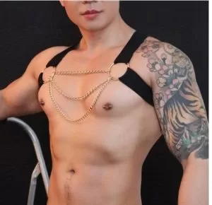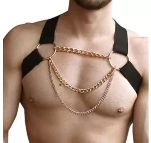 Arreio Peitoral Preto em Elástico Com Correntes BDSM Fetiche