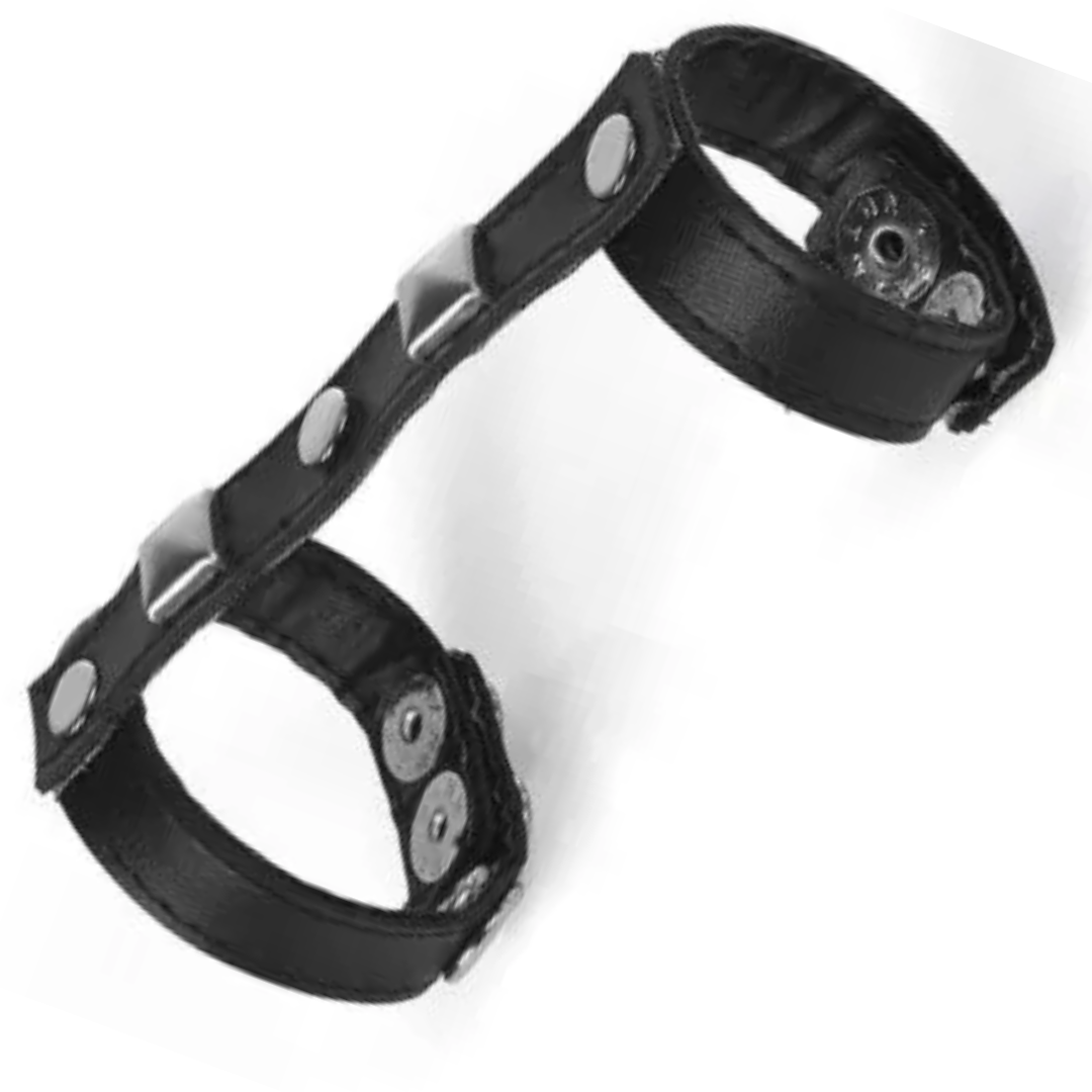 Para uma fantasia mais fetichista, este anel feito em couro sintético deixa o pênis mais sexy e seus adereços em metal regulam a largura.
