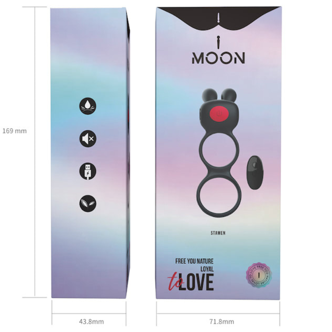 Anel peniano e escrotal em silicone com estimulador – IMOON. Possui 10 modos de vibracão e controle remoto sem fio.Com duas alças para o pénis e os testículos, ele garante uma concentração sanguínea permitindo que sua ereção dure por mais tempo, oferecendo uma relação mais longa e gostosa!Este anel vibratório é verdadeiramente versátil, ao mesmo tempo que ele é um anel peniano, ele também conta com estimulador clitoriano ergonómico que vai levar a parceira (o) para o céu.Conta com 10 modos de vibração, fabricado em silicone, material macio e suave ao toque e adequado para a pele. Toda a brincadeira pode ser controlada pelo controle sem fio, com direito a função pausa!