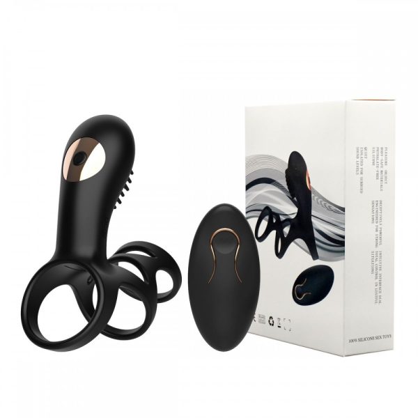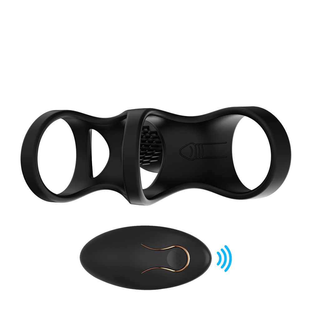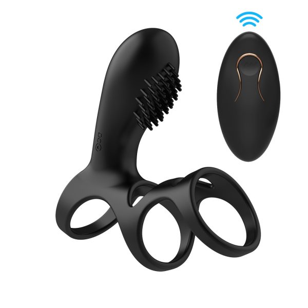 Anel peniano com 10 modos de vibração, possui controle remoto. Com estimulador de prostata e texturas massageadoras que completam o seu design, com suporte escrotal e de membro para uma experiência única. Possui toque macio e aveludado. Carregador USB incluso. Medidas: 10 x 9,5 x 3,6cm. Peso: 57g. Material: Silicone + ABS.