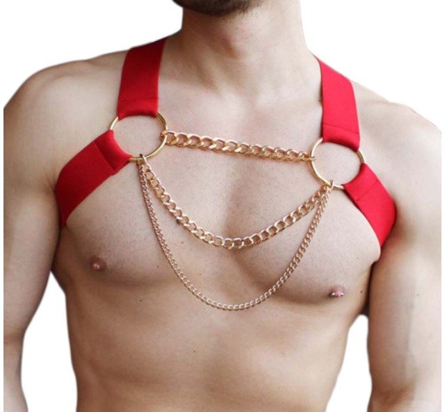 Arreio Peitoral Vermelho em Elastico Com Correntes BDSM Fetiche
