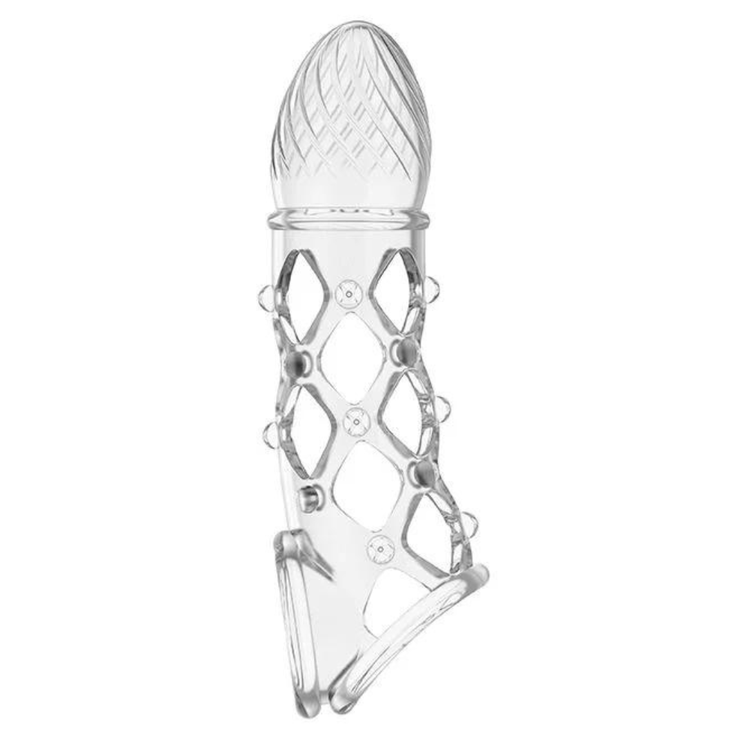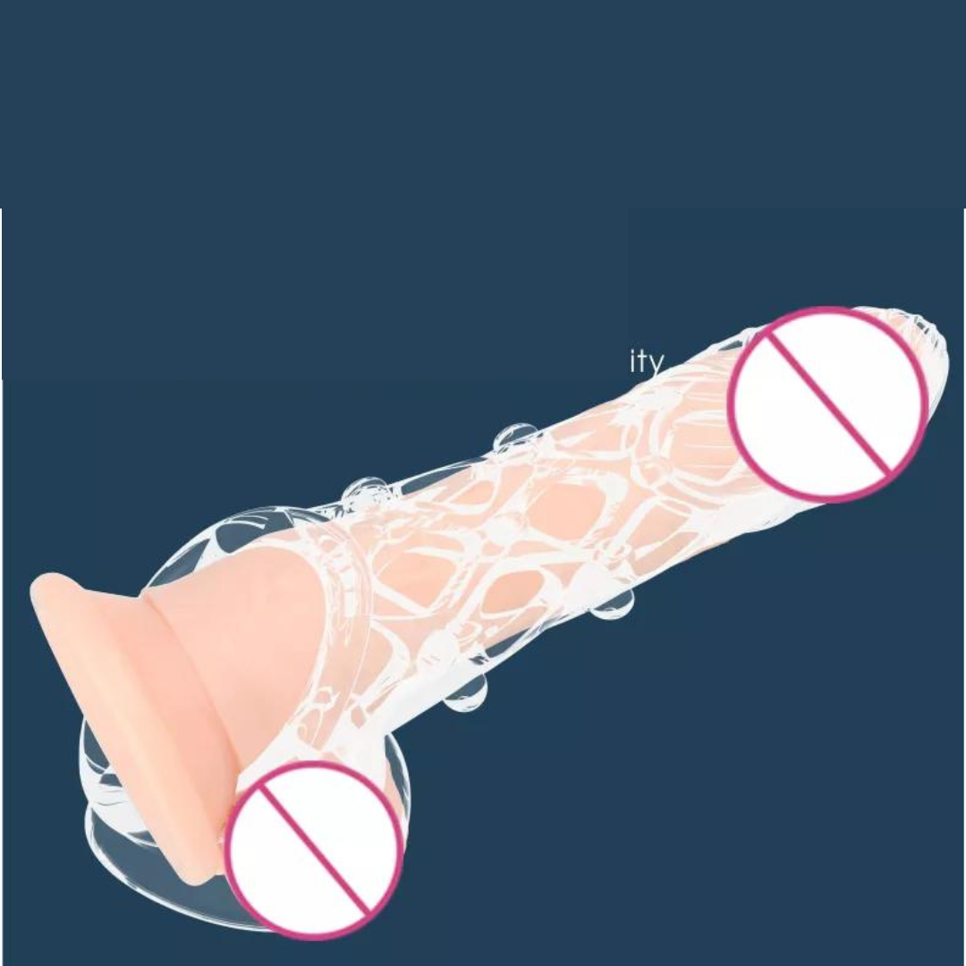 A capa peniana realístico Transparente proporciona prazer dobrado, com abertura para fixação no escroto
