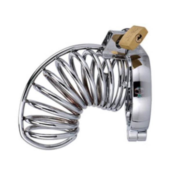 Cinto de castidade masculino vazado com anel para o escroto e cadeado.