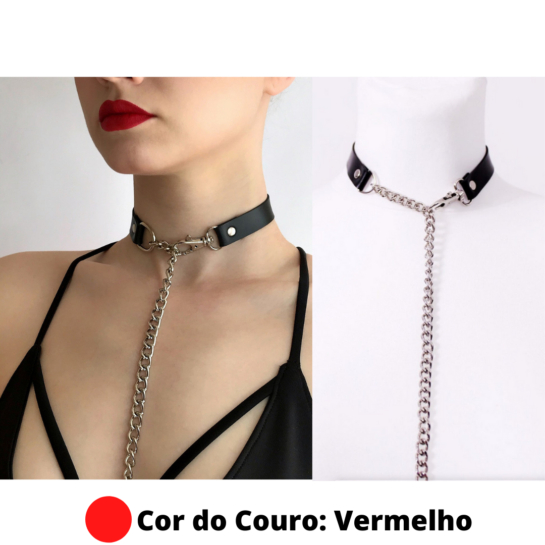 Colar Acessório Com Sintético Vermelho e Correntes Dourada