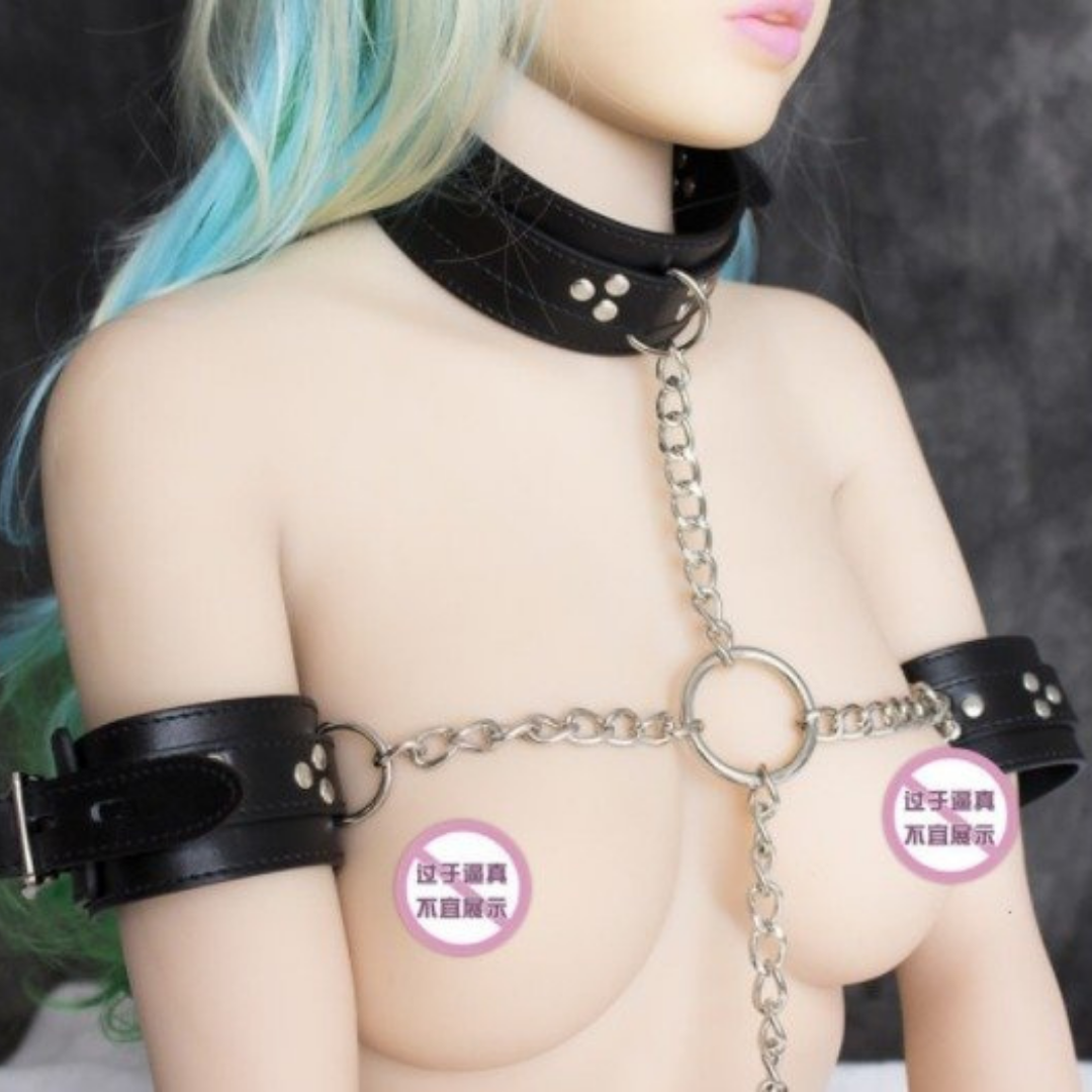 Coleira Em Couro Preto Com 4 Algemas e Correntes Fetiche BDSM