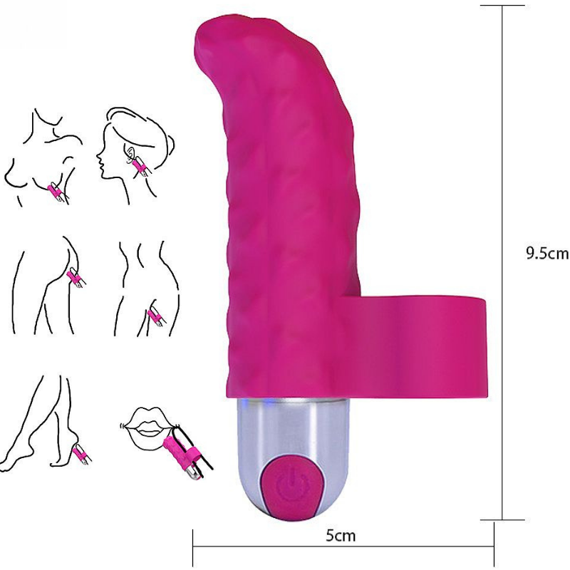 Dedeira em silicone com textura e relevos e textura, que estimula o clítoris, com cápsula vibratória, que pode ser usada separadamente. A dedeira possui alças para os dedos, o que facilita o manuseio e a estimulação. 10 modos de vibração