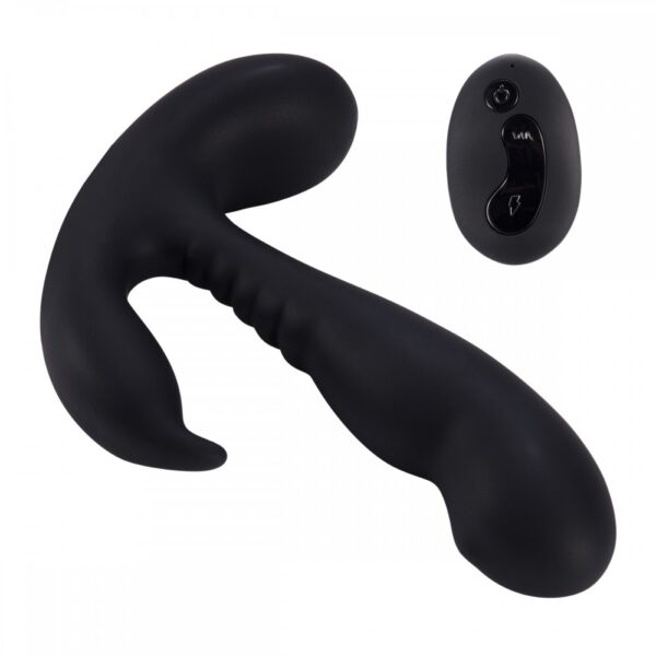 Estimulador de Próstata com controle remoto feito em silicone cirúrgico com 2 motores e 10 níveis de vibrações com 5 modos de movimento no Ponto-P. Recarregável via cabo usb. Medidas: 14x3cm Peso: 148g.