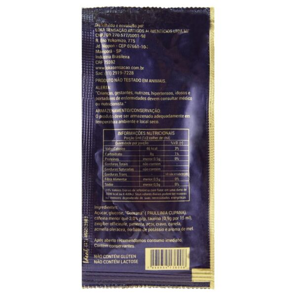 Guaraná (paulinia cupana/1,3g por 15ml), taurina (0,9g por 15ml), gengibre, pimenta, açaí, cravo, canela, acmella oleracea, sorbato de potássio e aroma de mel