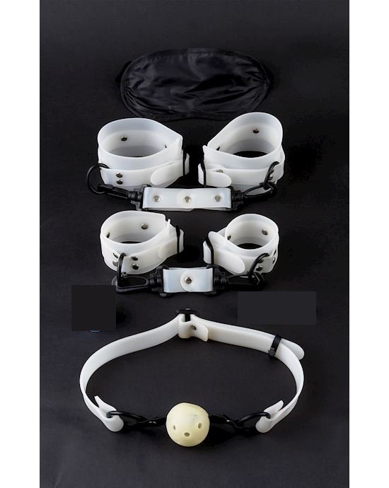 Este produto é um kit bondage com produtos eficientes e de qualidade. Consiste em algema e tornozeleira que são ligadas por um gancho de metal, além de uma mordaça de borracha com suporte ajustável. O grande diferencial deste kit bondage é que ele é fosforescente, o que deixa o clima mais excitante, pois a relação ficará ainda mais intensa no escuro. O kit bondage vem com uma venda preta grátis.