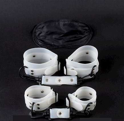 Modo de Uso: Prenda as algemas nos punhos e nos tornozelos. Ajuste a bola da mordaça na boca e seguida prenda na parte da nuca. Coloque a venda nos olhos ajustando-a.