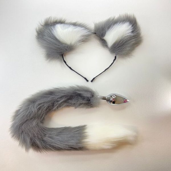 Kit Orelhinhas de Pelúcia com Plug Anal Calda Raposa Cinza Com Branco
