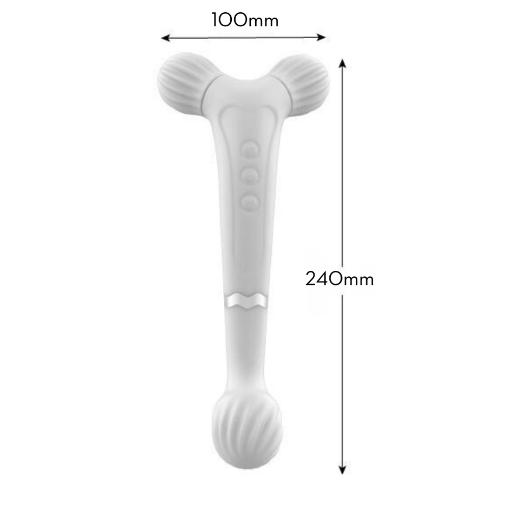 Massageador com 3 pontas massageadoras, sendo: Uma ponta única e uma ponta dupla (Podendo ser utilizadas em conjunto ou separadamente). Possui toque suave, aveludado e detalhes metalizados