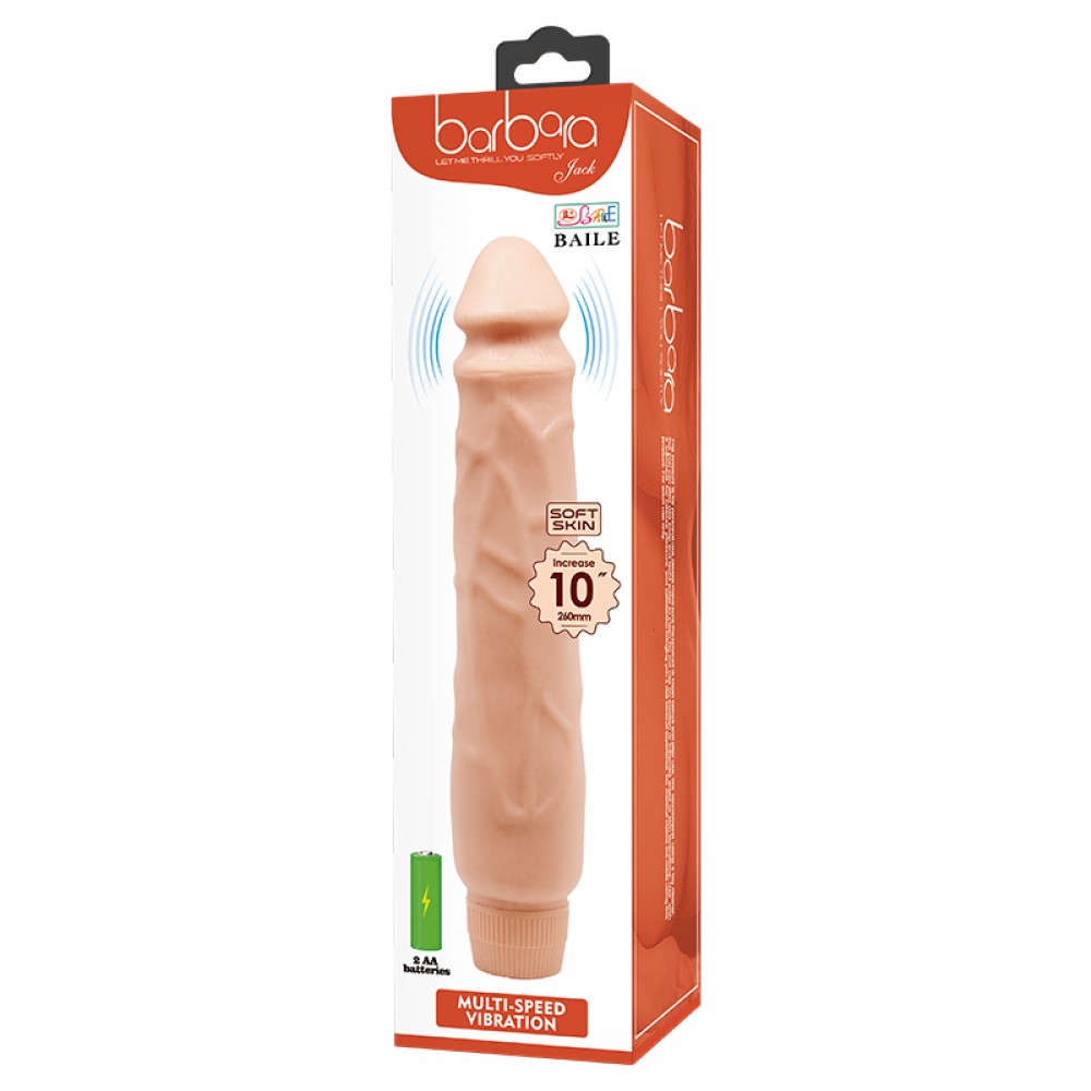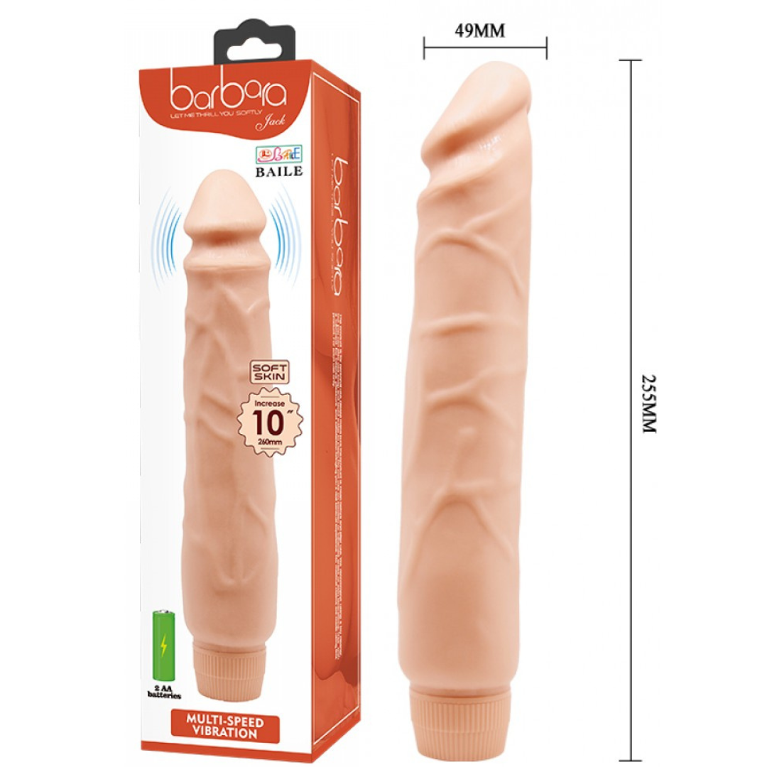 Prótese realística. Possui vibração multivelocidade, super macio, leve textura imitando as veias na pele, glande com saliência lisa e exposta. O motor possui uma poderosa vibração e a velocidade pode ser ajustada com o giro do botão na base do produto, iniciando com a vibração fraca, indo ao forte em apenas um giro em sua base. Base parcialmente a prova d’água.