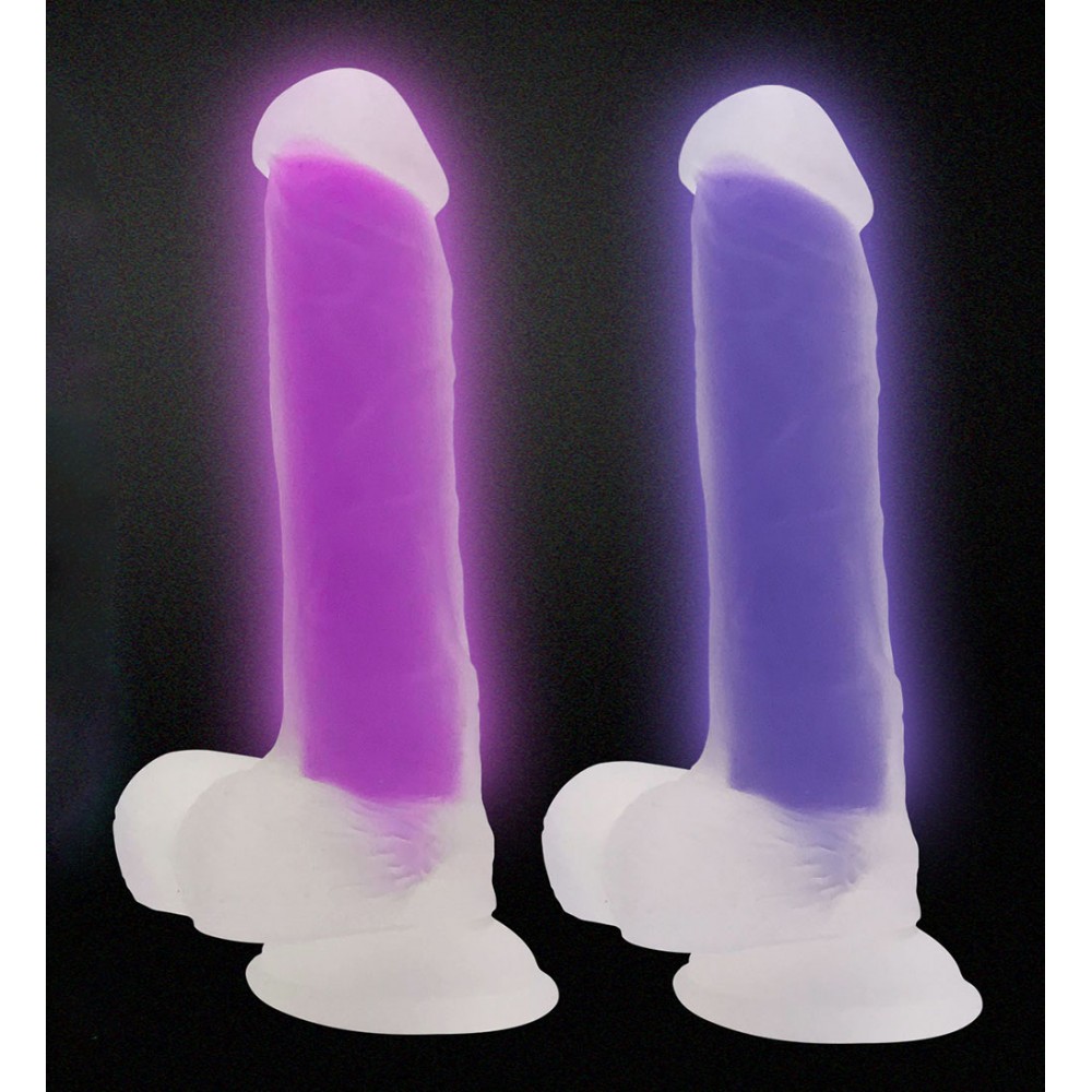 Pênis realistico com glande saltada, escroto e ventosa resistente. Confeccionado em material macio, trazendo naturalidade e realismo a prótese.As cores são florescentes e brilham a luz negra.