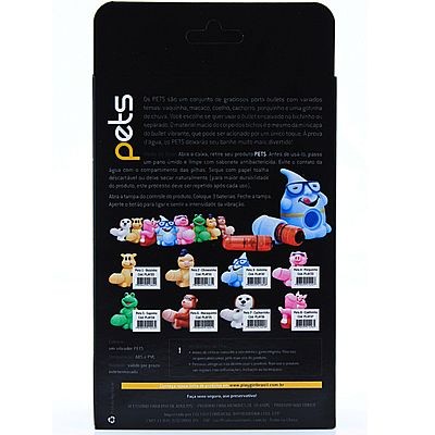 Os PETS são um conjunto de graciosos porta bullets com variados temas: vaquinha, macaco, coelho, cachorro, porquinho e uma gotinha de chuva. Você escolhe se quer usar o bullet encaixado no bichinho ou separado. O material macio do corpo dos bichos é o mesmo da minicapa do bullet vibrante, que pode ser acionado por um único toque. À prova d’água, os PETS deixarão seu banho muito mais divertido!