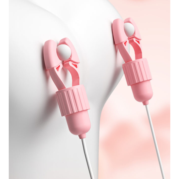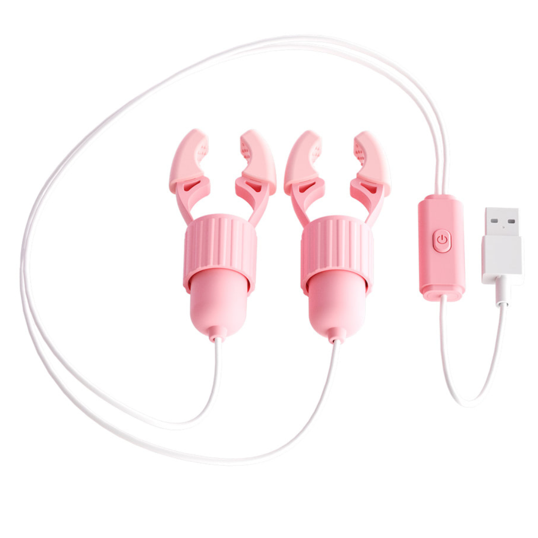 Prendedores de Mamilos de Pressão com Cápsula vibratória, USB. Possui 12 modos de vibração, Material: Silicone + ABS. Produto funciona diretamente na tomada via USB,podendo ligar no computador direto sem bateria, Não É Recarregável.