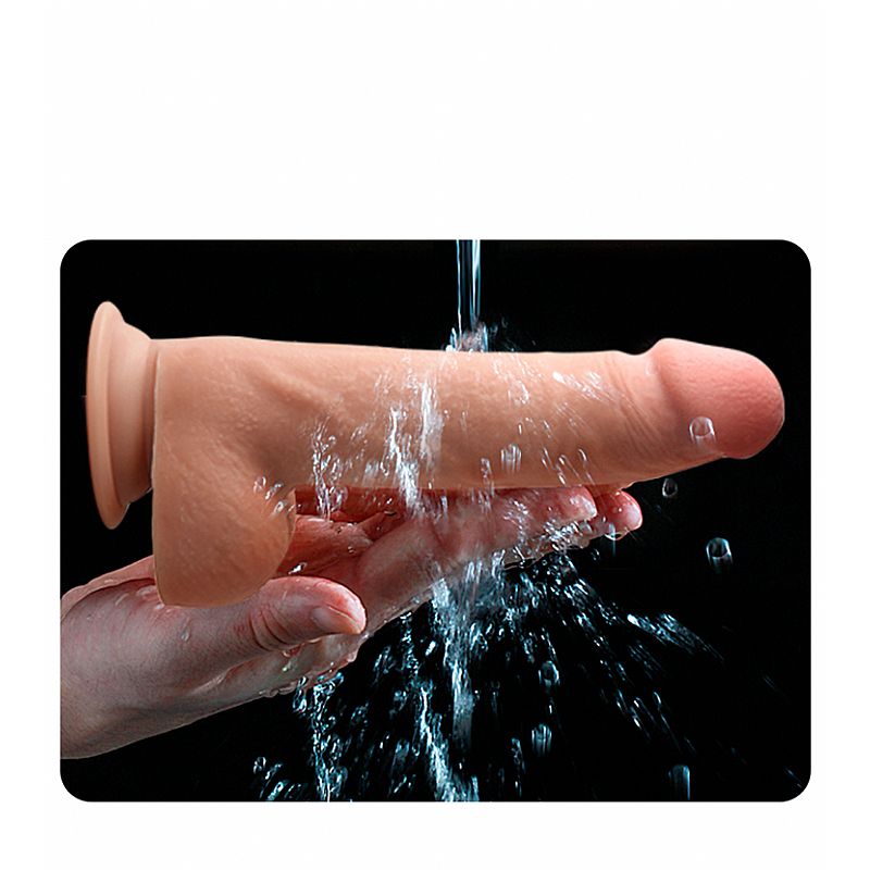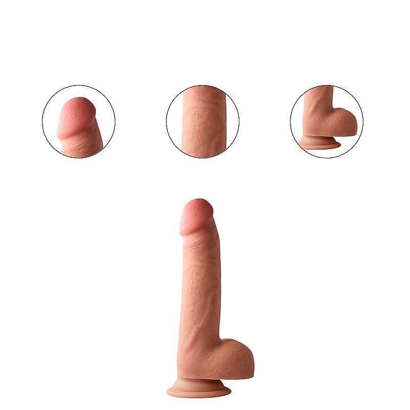 Prótese realística em forma de pênis, confeccionado em TPE possui glande definida, textura de veias, escroto e ventosa para penetrações em ângulo reto.