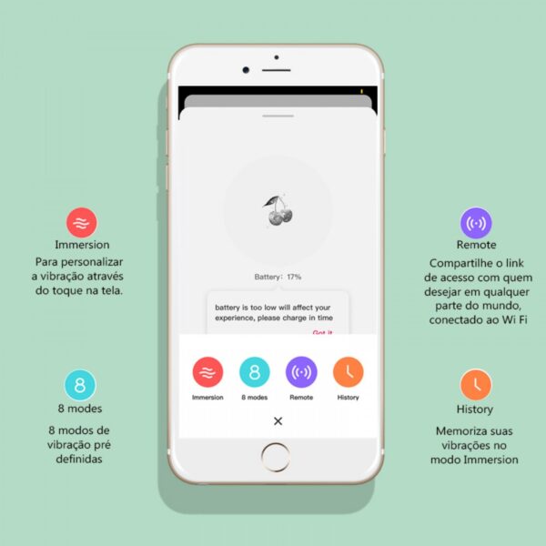 Vibrador com estimulador clitoriano, 8 modos de vibração e função de auto aquecimento, possui comandos wireless via Bluetooth pelo aplicativo que pode ser baixado como indica instruções dentro da embalagem.