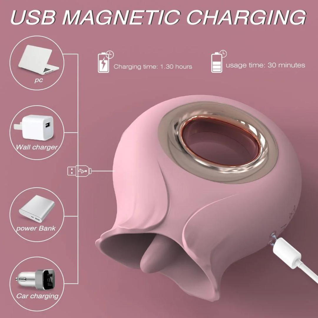 Estimulador Clitoriano Língua com 9 modos de vibração.Um estimulador de luxo, com aro dourado para apoio dos dedos. O bocal é muito macio e flexível, para poder acoplar na região clitorial. Possui 9 velocidades e sua língua faz as estimulações nestas intensidades. Ao ligar no botão power por apenas 3 segundos, o led já acende, indicando que já pode usa-lo. Ao tocar no power novamente, a língua começa a se movimentar. Já o seu segundo botão é para mudar as intensidades de vibrações. Seu carregamento é por USB magnético. Modo de Usar: Certifique-se que o produto esteja totalmente carregado. Ligue o botão power por 3 segundos. Clique nele para iniciar a estimulação. O segundo botão muda as velocidades.