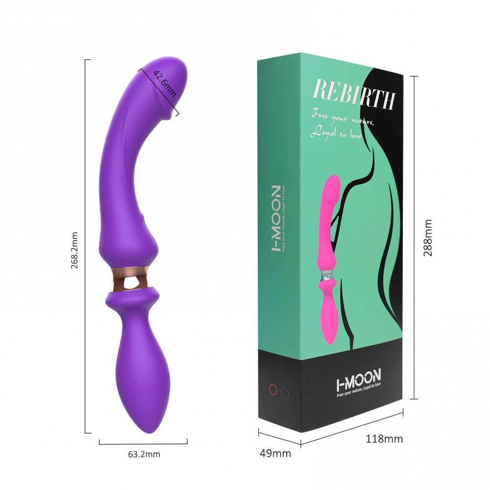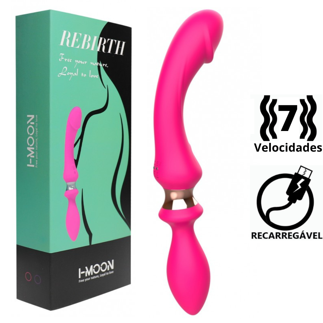 Rebirth – Vibrador de dupla penetração. Com 7 modos de vibração e dois lados. Ponta levemente curvada, toque suave e aveludado. Recarregável, acompanha cabo USB.