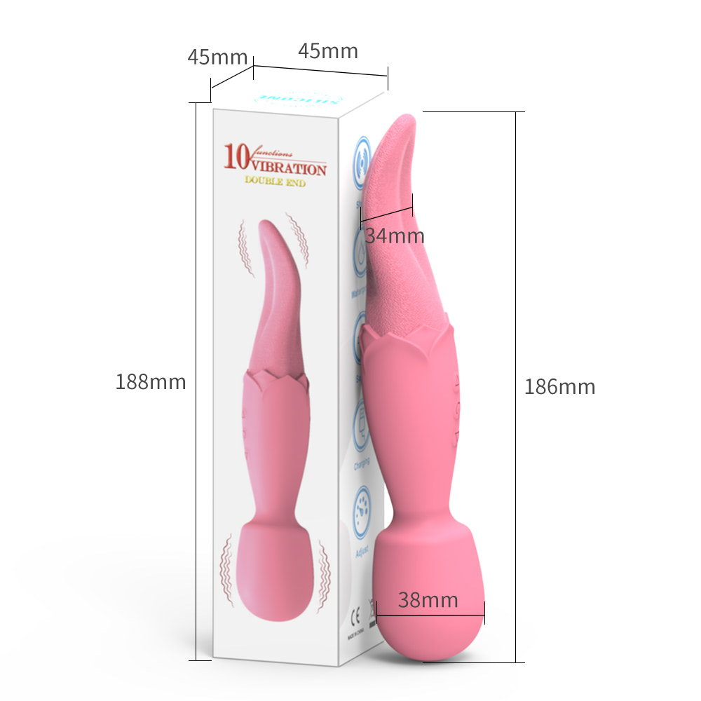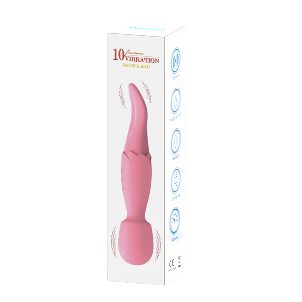 Vibrador duplo Varinha Magica com 10 modos de vibração. Um vibrador em formato de língua e do outro lado um estimulador para toda a vulva como uma boa varinha mágica. É um vibrador duplo sendo uma ponta ele é um vibrador em formato de língua com curvatura especial para estimular o seu Ponto G,e do outro lado ele é um vibrador com um motor potente para experimentar novas vibrações em toda região do clitóris, muito além da glande.