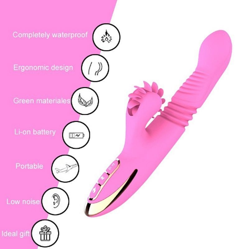 Vella feito em material macio de toque agradável e fácil limpeza. Tem plug lateral para estimulo do clitóris. Tem 7 níveis de rotação, vai e vem e 7 níveis de vibração. Com função de aquecimento.