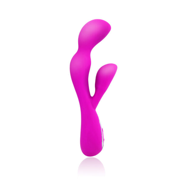 Vibrador de dupla estimulação. Possui curvatura projetada para estimular o ponto G. O estimulador lateral estimula a região do clitóris durante a penetração.