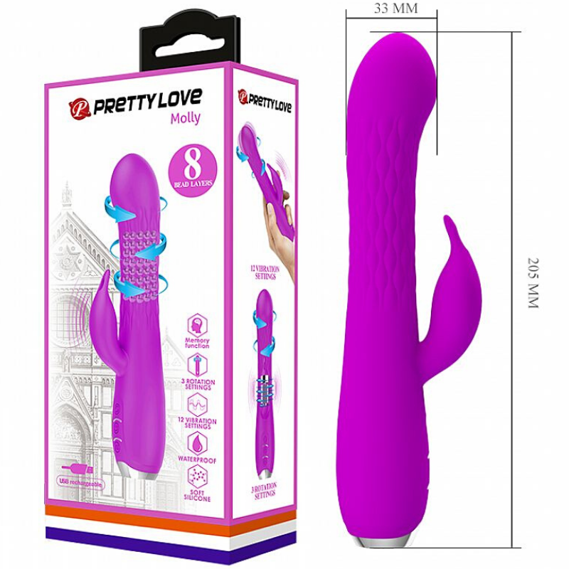 Molly é feito em material macio com pérolas metálicas internas para estimulação, possui 3 velocidades de rotação, e estimulador de clitóris com 12 modos de vibrações, as duas funções podem ser acionadas juntas ou separadamente, tudo regulado por botões na base do vibrador.